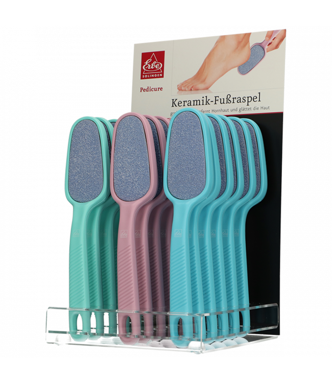 Erbe keramische voetvijl Voor voetverzorging en het verwijderen van eelt op de hielen, door de ergonomische vorm ligt de vijl makkelijk in de hand. Het vijloppervlak is gemaakt van keramiek aan de ene zijde en schuurpapier aan de andere zijde Langdurige kwaliteit, gemaakt in Solingen Duitsland Formaat voetvijl: 21.5cm 6x groen, 6x roze, 6x blauw