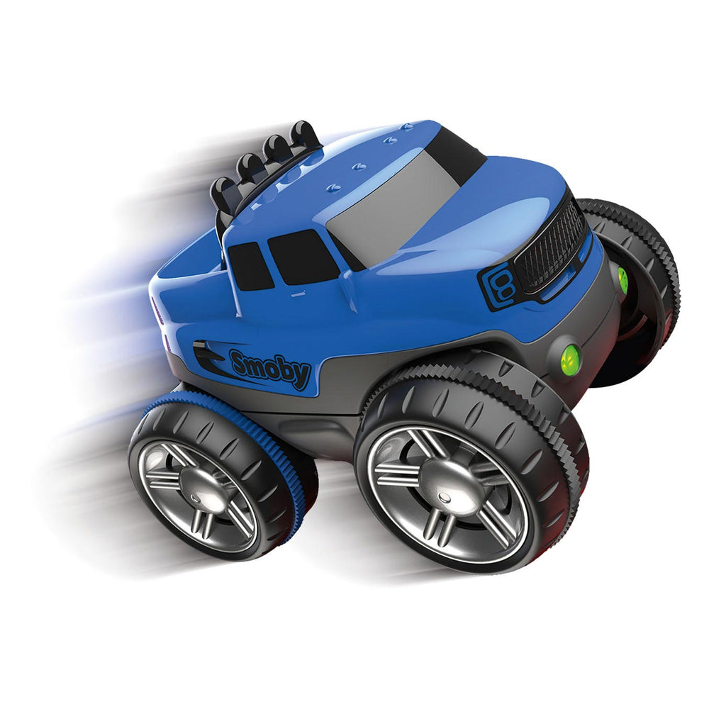 Een blauwe truck met lichteffecten en een carrosserie om te bevestigen voor de Smoby FleXtreme racebaan.