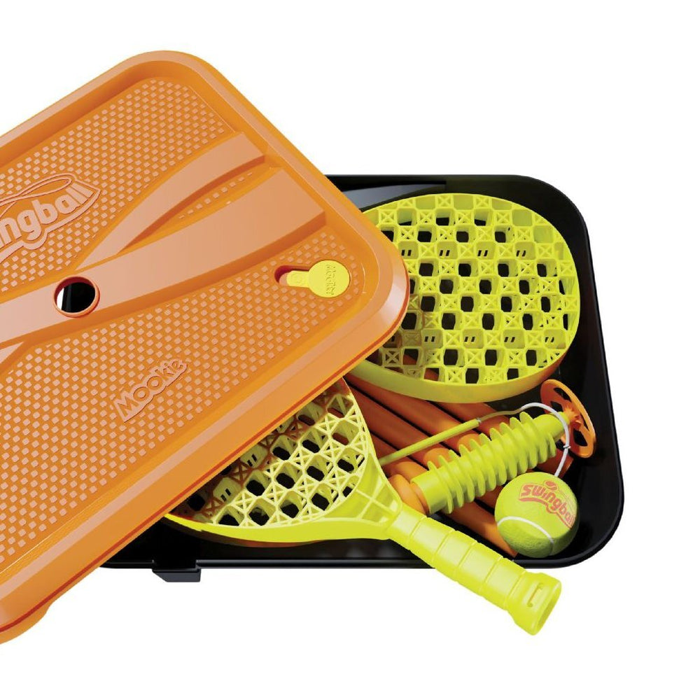 Een spel dat iedereen in beweging zal krijgen. Compleet met een in hoogte verstelbare paal (1,4 meter), een rubberen tennisbal en twee tennisrackets. De nieuwe en verbeterde basis bevat een geïntegreerd handvat voor gemakkelijk transport en een waterstop om morsen te voorkomen bij het vullen. De All Surface-basis heeft speciale voetjes voor een stabiele gameplay en kan worden omgevormd tot een handige draagkoffer om alles in op te bergen. Swingball is niet alleen geschikt voor in de achtertuin: dankzij de basis kun je overal en op elk oppervlak spelen. Vul gewoon de basis met zand of water en dan ben je klaar om een balletje te slaan! Gemonteerde afmetingen: 46,6 x 140 x 9,6 cm. Geschikt voor kinderen vanaf 4 jaar.
