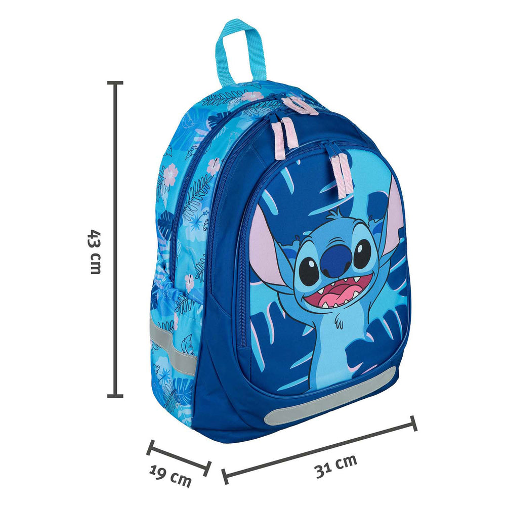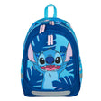 Blauwe Stitch rugzak met 3 grote vakken en een elastische flessenhouder. De tas heeft verstelbare en gewatteerde schouderbanden en is 43 x 31 x 19 cm groot.