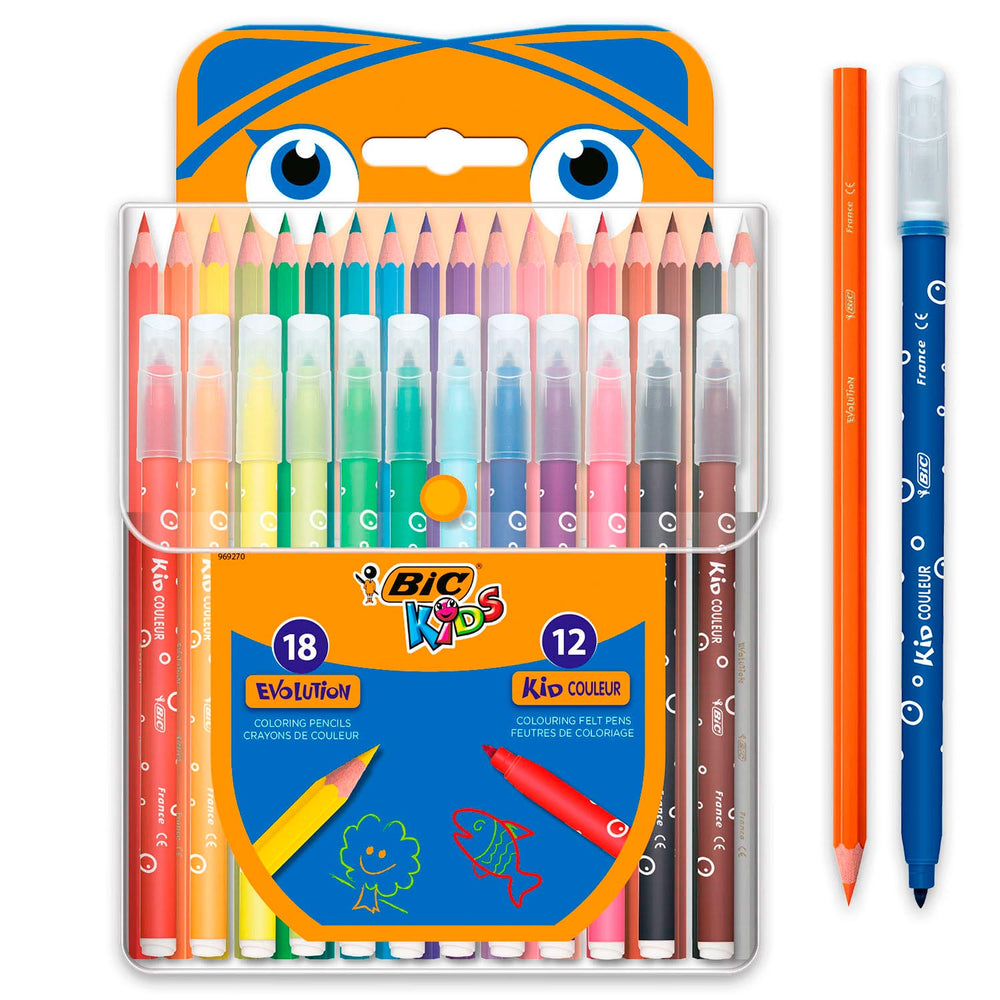 • Set bevat 18 Bic Kids Evolution kleurpotloden en 12 Bic Kids Kid Couleur stiften in verschillende kleuren