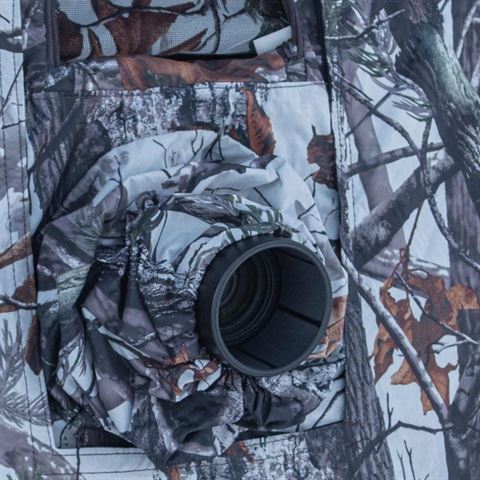 De Snoot is gemaakt van hetzelfde sterke materiaal als onze tenten. Alle snoots zijn verkrijgbaar in dezelfde, zelfgemaakte camouflagekleur/patroon dat overeenkomt met de kleuren/patronen van onze fototenten en zijn aan de binnenkant zwart gecoat. Bevestiging aan uw camouflagetent is eenvoudig: verwijder het originele fotovenster en bevestig de Snoot met het klittenband. Dit duurt maar een paar seconden. Daarna kan de Snoot stevig aan de lens of zonnekap worden bevestigd door middel van het koord met de clip. Direct boven de Snoot zit een extra kijkvenster met insectennetje, zodat u de omgeving perfect in de gaten kunt houden. De Snoot is waterdicht bij normale regen, maar kan uiteraard extra waterdicht worden gemaakt met een waterafstotende spray.