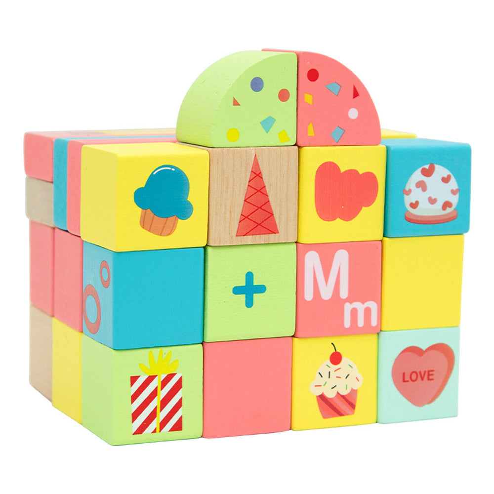 Houten bouwblokjes van Classic World voor peuters en kleuters met schattige snoep- en zoetighedenprintjes. In vrolijke snoepkleuren en met illustraties van o.a. snoepjes, hartjes en gebakjes.