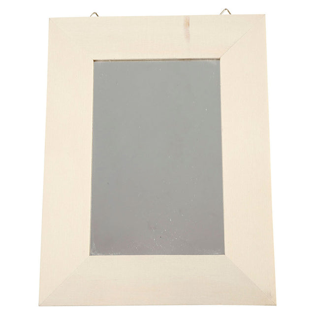 Dit vierkantje spiegeltje heeft een licht houten lijst die eventueel nog versierd kan worden. Variatie is mogelijk, want het spiegeltje kan ook vervangen worden door een foto!