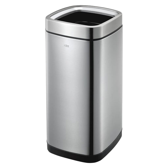 Deze 35 L grote Laguna afvalbak van EKO is een vierkante prullenbak van geborsteld roestvrij staal met een kunststof binnenbak en een open bovenkant.