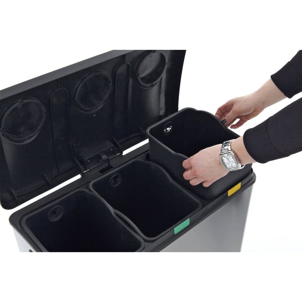 De matzilverkleurige EKO Rejoice pedaalemmer heeft drie kunststof binnenbakken van 12 L.