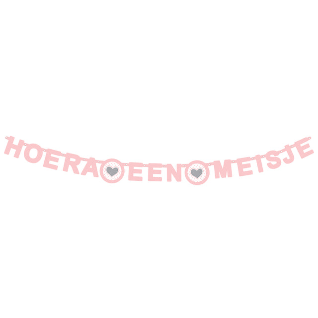 Maak je babyshower of kraamfeest extra feestelijk met deze letterguirlande. De letters vormen 'hoera een meisje' in het roze. De guirlande heeft ook rondjes met hartjes tussen de woorden voor een leuke uitstraling.