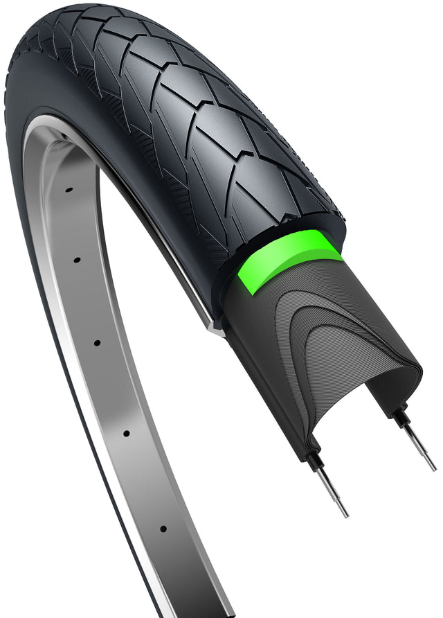 Wil je lekker relaxt fietsen? Probeer dan onze Edge Mambo buitenband. Fietsen met deze band is het net ook je zweeft. Omdat hij wat groter is en dus meer lucht bevat, fietst hij heerlijk comfortabel. Er zit vering in en hij rijdt licht. Met deze Protect uitvoering krijg je een band met 3 mm anti-lekbescherming wat waterdichte met een beschermingsniveau van 5. Deze band is ook uitermate geschikt voor te gebruiken op een bakfiets / cargofiets. Productspecificaties: