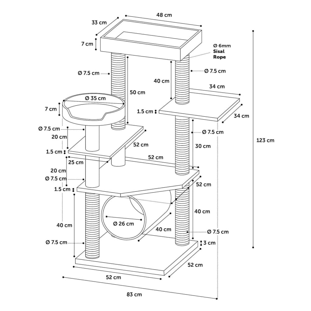Dit kattenmeubel heeft 3 rustplekken en 3 krabpalen. Het is bekleed met zacht pluche en dankzij de strakke lijnen en het natuurlijke kleurenschema past het kattenkrabmeubel in elk interieur. Het beschikt ook over 2 comfortabele gevoerde plateaus en een rusttunnel.