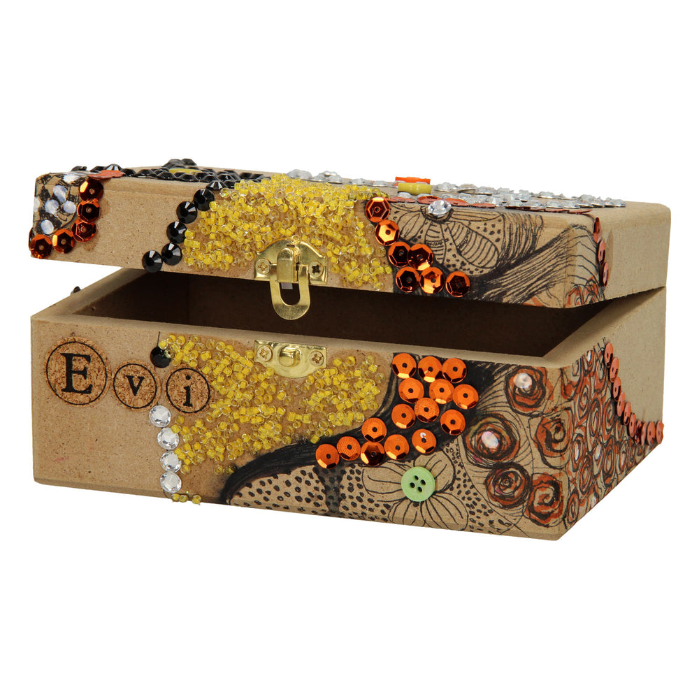 Een houten rechthoekige kist gemaakt van MDF. Deze kist kan naar eigen wens versierd worden of gebruikt worden om spullen in op te bergen. De kist is voorzien van gouden scharnieren, waardoor deze gemakkelijk geopend en gesloten kan worden.