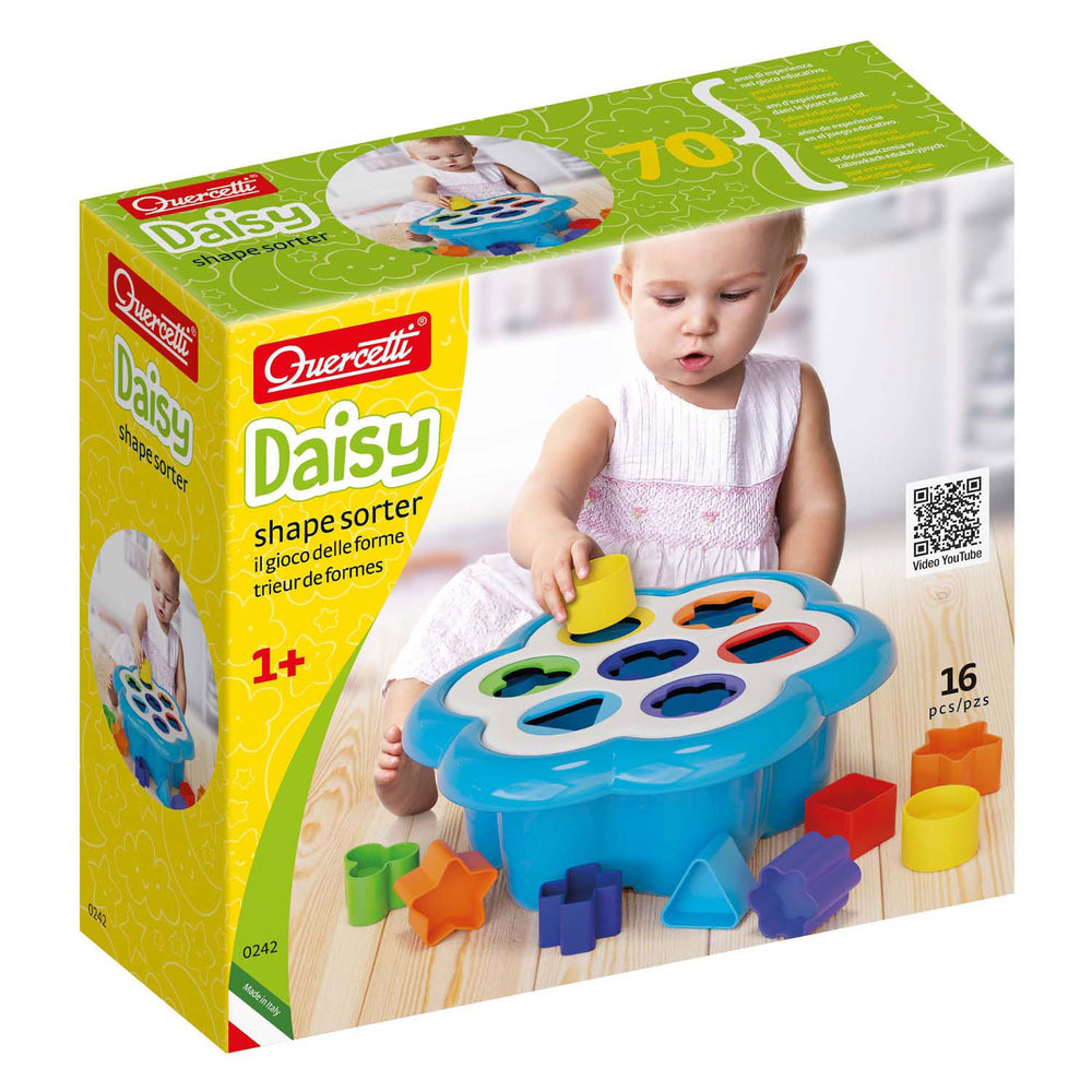 De Quercetti tijdloze favoriet: de vormsorteerder. Het heeft de vorm van een bloem, heeft zeven gaten in verschillende maten en vrolijke kleuren die uw kind zal leren herkennen.