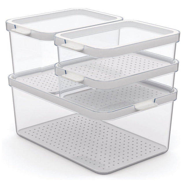 Deze set bestaande uit 4 verschillende formaten kunnen met elkaar worden gecombineerd, waardoor een compact en ruimtebesparend systeem ontstaat. Het inzetstuk met de gaatjes die je kunt verwijderen, laat het vocht weglopen, waardoor het voedsel langer vers blijft en ook beter beschermd is. Je kunt het multifunctionele deksel 180° draaien en dit biedt meer ruimte of perfecte stapelbaarheid. Je kunt ook altijd de inhoud in de gaten houden dankzij de transparante bodem. Richt je koelkast volledig opnieuw in en bespaar tijd bij het zoeken naar het gewenste voedsel. De mogelijkheid om de boxen te gebruiken bij temperaturen tot -20 ? maakt nog meer toepassingsgebieden mogelijk en de boxen kunnen vervolgens eenvoudig in de vaatwasser worden gereinigd. Het fraaie ontwerp van de koelkastorganizers is een blikvanger in je keuken en koelkast.