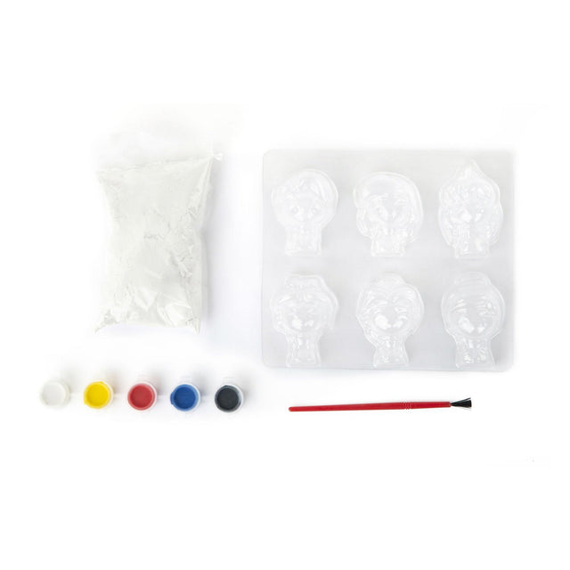 • Inhoud: gips, mal voor 6 karakters, 1 verfkwastje en 5 potjes verf