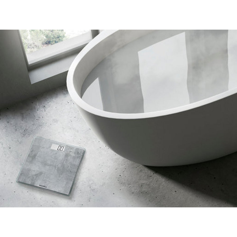 Met zijn stijlvolle betonlook is een blikvanger in elke badkamer. Hoogwaardig veiligheidsglas biedt een comfortabele standaard en kan tot 180 kg dragen.Zodra u op het weegoppervlak stapt, wordt de weegschaal ingeschakeld en wordt uw persoonlijke lichaamsgewicht in stappen van 100 g weergegeven op het gemakkelijk af te lezen LCD-scherm.Na het wegen schakelt hij automatisch uit - dit bespaart energie en maakt het mogelijk de meegeleverde batterijen lang te gebruiken.Het batterijvak is stevig vastgeschroefd en zorgt zo voor de veiligheid van de kleintjes.