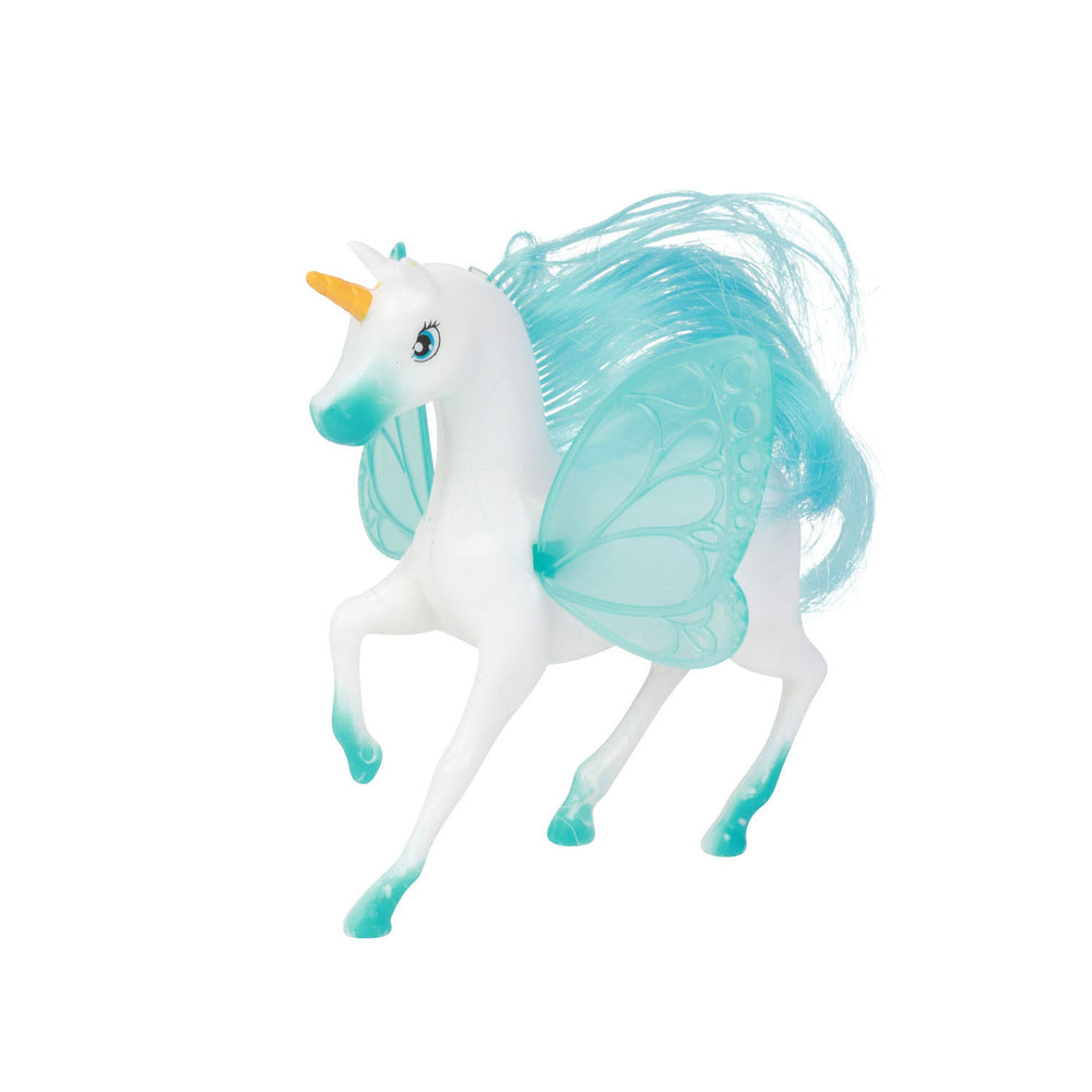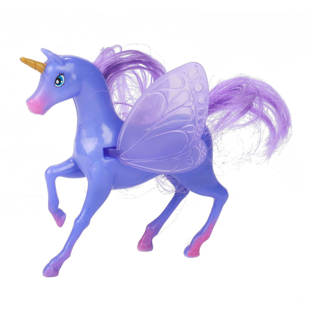 Set van 3 kleine plastic eenhoorns in een unikleur. De manen en staart zijn zacht, de doorzichtige vleugels zijn hard. Maar ze kunnen wel bewegen. Dus fladder snel naar een andere wereld.