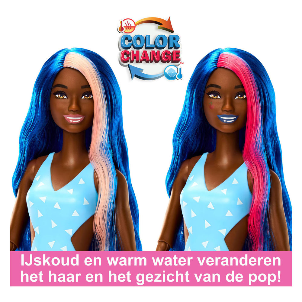 Ontdek de Barbie Pop Reveal! Een feest van uitpakken met acht zintuiglijke verrassingen. Maak de verpakking open, geïnspireerd op een drinkbeker, en ontdek een van de vier smaken uit de Fruit-serie: aardbeienlimonade, vruchtenbowl, watermeloensap of druivenprik. Geniet van het kleurrijke slijm en de accessoires die in de ijsblokjes verborgen zitten. Deze beweegbare pop met kleur veranderend haar en make-up is perfect om te verzamelen!