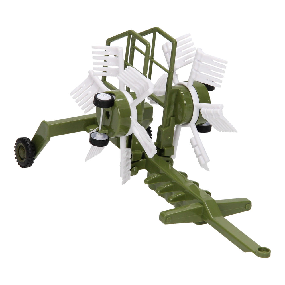 Deze kunststof tractor met groene hooischudder is speciaal ontworpen om hooi te schudden op het land. Het gras op je boerderij kan op deze manier sneller drogen zodat het tot balen geperst kan worden. De hooischudder kan losgekoppeld worden van de tractor en de armen van de hooischudder zijn in- en uitklapbaar waardoor hij ook over de weg vervoerd kan worden. De motorkap van de tractor kan ook omhoog. Geschikt vanaf drie jaar. De tractor is 20 x 20 x 10 cm en de aanhanger heeft een lengte van 24 cm. De totale lengte van de tractor met aanhanger is 44 cm. De tractor is verkrijgbaar in het groen, blauw en rood.