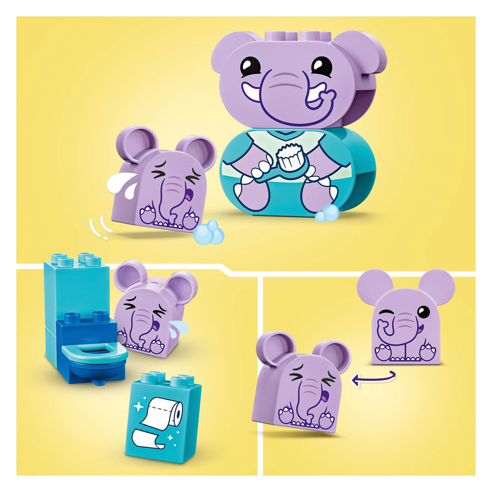 Help peuters vanaf 18 maanden hun gevoelens rondom wassen te uiten met het educatieve peuterspeelgoed Mijn eerste dagelijkse gewoontes in bad (10413). Deze dieren speelset wordt geleverd met 2 speelgoed olifanten figuren - een ouder en een jong - plus een bad, douche en toilet. Peuters gaan samen met hun ouders en nieuwe LEGO DUPLO dierenvriendjes naar de badkamer en doen alsof ze het baby olifantje wassen terwijl ze het belang van goede hygiëne ontdekken.