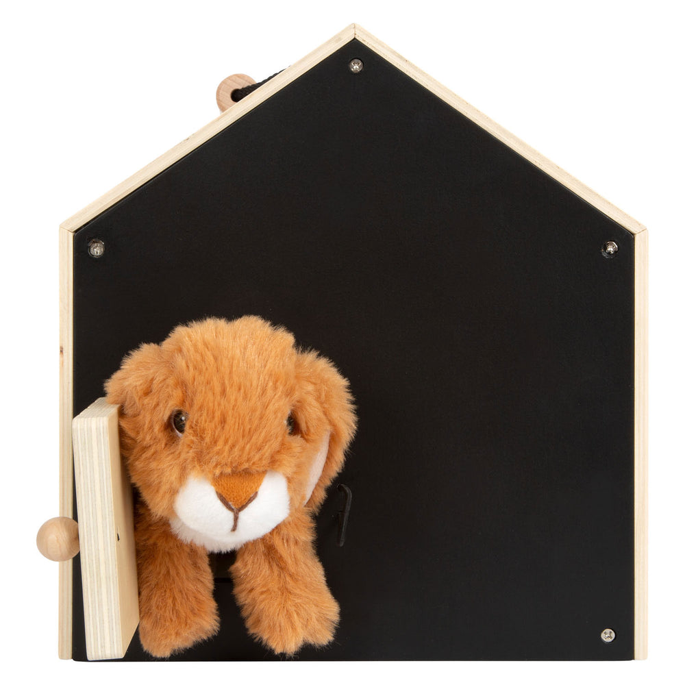 Een konijnenhok voor de pluche langoren! Dit dubbele hok van stabiel hout dat ook als transportmiddel gebruikt kan worden, bestaat uit twee kleine hokjes die met bollen en lussen met elkaar verbonden kunnen worden. In de ene helft kan het knuffelkonijn slapen en ongestoord blijven dankzij de magnetisch sluitende klepdeur, en aan de andere kant kan hij door een gaas om zich heen kijken. Twee gaashekken kunnen aan de hokken worden gekoppeld om een buitenverblijf te creëren. Inclusief pluchen konijn, borstel, schaaltje, wortels van hout en vilt, een stukje sla en stukjes konijnenpoep van vilt.