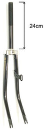 "Deze universele zwarte voorvork is geschikt voor wielmaat 26 inch. Met een glanzend zwarte kleur en rembevestiging voor V-brake en trommelrem/rollerbrake remnokken, is deze voorvork een betrouwbare keuze. De vorkbuis heeft een diameter van 1 inch / 25,4 mm en een lengte van 245 mm. De draad van de vorkbuis is 125 mm lang. De voorvork is van hoge kwaliteit en perfect voor verschillende fietsen." Productspecificaties