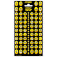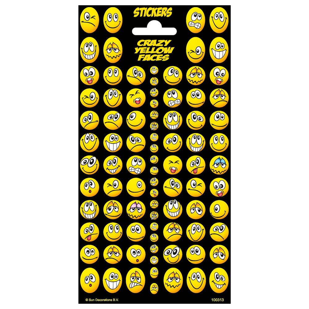 Stickervel met 88 stickers van maffe gele gezichten met glitters erop.