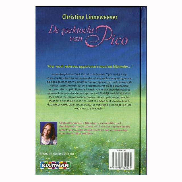 Vanaf zijn geboorte voelt Pico zich ongewenst. Zijn moeder is een raszuivere New Forestpony en ze had nooit een veulen mogen krijgen van die appaloosahengst. Wie houdt er nou van appaloosa’s, met die vreemde vlekken? Niemand toch? Als Pico verkocht wordt op de paardenmarkt en terechtkomt op de Sissende S Ranch, kan hij zijn ogen dan ook niet geloven. Er wonen hier allemaal appaloosa’s! Eindelijk voelt hij zich thuis. Pico maakt veel nieuwe vrienden en leert rijden op de westernmanier. Maar het belangrijkste voor Pico is dat er iemand echt van hem houdt: de dochter van de eigenaars, Martine. Tot werkelijk alles misloopt en Pico weg moet van de ranch… Uitvoering: Gebonden, 224 pagina's.