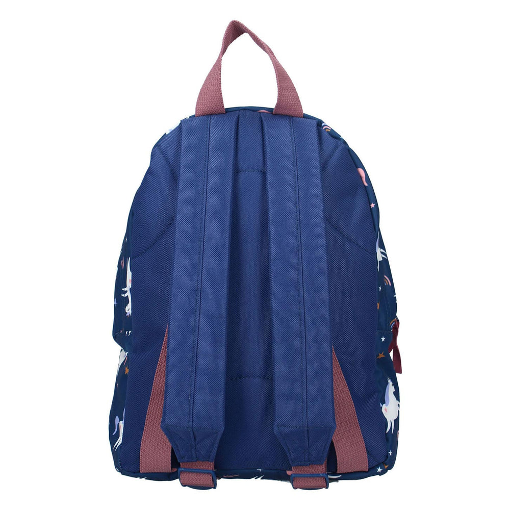 Laat de fantasie van je kindje de vrije loop met deze leuke rugzakken uit de 'Imagination' collectie! Deze collectie is voorzien van rugzakken voor kleine kindjes met magische kleurrijke dierenprints. Op deze rugzak zijn magische unicorns afgebeeld. De rugzak heeft een ruim voorvak waarin je kindje al zijn of haar spullen in kwijt kan. De tas is blauw van kleur en afgewerkt met roze details. De schouderbanden zijn verstelbaar en met de ritsjes is de tas eenvoudig te openen en sluiten. Zo kan een kind in het grote hoofdvak al zijn of haar speelgoed of logeerspullen stoppen!