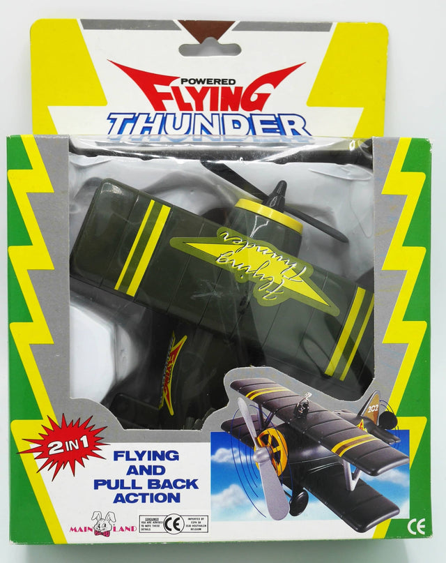 Flying Thunder vliegtuig met pul back of hang hem aan het plafond en hij gaat rondjes vliegen aan het draadje. Advies leeftijd vanaf 3 jaar. vleugel grote 16 cm.