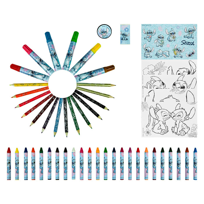 Grote kleurkoffer met afbeelding van Stitch erop. In de kleurkoffer vind je wel 51 stuks aan kleurgerij, zoals krijtjes, kleurpotloden, stiften, stickers, een puntenslijper en een gum. Uiteraard allemaal met Stitch thema! Geschikt voor kinderen vanaf 3 jaar oud. Stitch 51 delige kleurkoffer met handvat. Deze grote kleurkoffer met afbeelding van Stitch erop bevat 51 stuks aan kleurgerij, zoals krijtjes, kleurpotloden, stiften, stickers, een puntenslijper en een gum, allemaal in het Stitch thema, Afmeting verpakking: 35 x 20 x 3 cmKarakter: StitchMateriaal: Kunststof