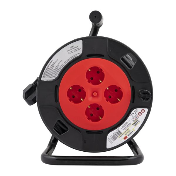 Kabelhaspel met 25 meter stroomkabel 3 x 1,5. Voorzien van 4 aansluitpunten met randaarde en overspanningsbeveiliging.