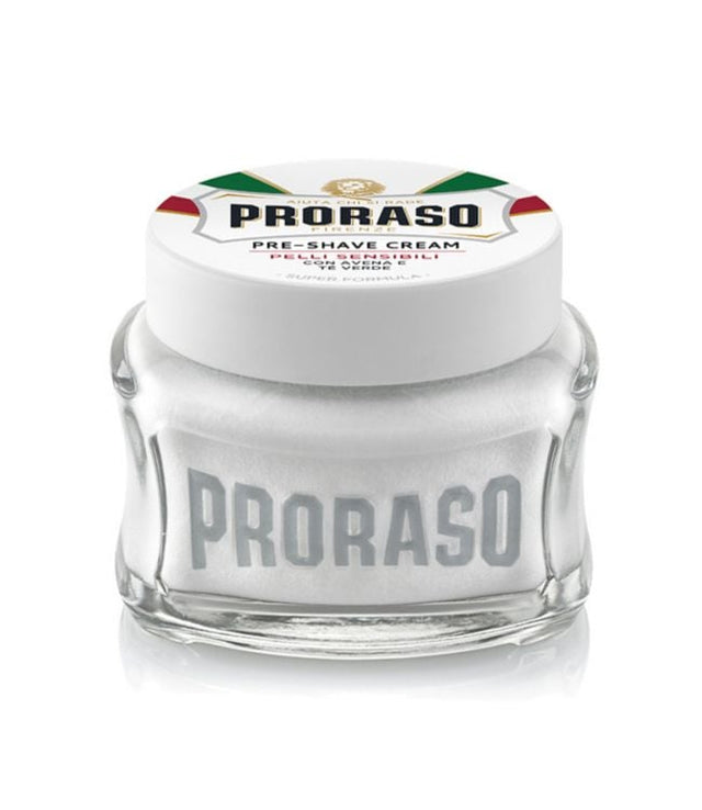 Proraso Pre & Ash Balsem Creme Met Groene Thee Sensitive Skin 100ml is een pre-shaving crème speciaal voor de gevoelige huid. Deze crème is verrijkt met havermoutextract en groene thee om de baard te verzachten en de huid te beschermen tijdens het scheren. Dankzij de crème glijdt het scheermes makkelijker over de baard en de huid, waardoor irritaties worden voorkomen. Voor een aangenamer, sneller en gemakkelijker scheren zonder de gevoelige huid te beschadigen. Gebruik: maak het gezicht vochtig en breng daarna de Pre-Shaving Cream aan. Masseer met ronddraaiende bewegingen, scheer vervolgens de baard met zeep of scheerschuim. Plus- en minpunten Geschikt voor de gevoelige huid Bevat aloë vera, groene thee en vitamine E Pre-shaving crème