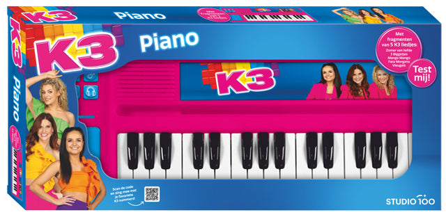 Deze elektrische K3-piano is blauw en heeft een lengte van 49 centimeter. Het bevat 5 fragmenten van K3-liedjes en heeft een aansluiting voor een hoofdtelefoon. Daarnaast zijn er knoppen om van toonaard te wisselen, achtergrondgeluiden toe te voegen, aanmoedigingen van de meisjes te krijgen en het volume te regelen. Deze piano werkt op batterijen (3 x AAA) en is geschikt voor kinderen vanaf 3 jaar oud.