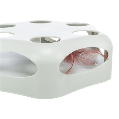 Het is een interactief speeltje voor nieuwsgierige katten. De veer in het midden beweegt onvoorspelbaar heen en weer, stopt af en teen en verandert experimentele van richting - perfect om het jachtinstinct van je kat te prikkelen. Het speeltje kan gevuld worden met kleine accessoiressnoepjes voor extra motivatie. Dankzij de elastische voetjes blijft het stevig staan ​​tijdens het spelen. Na ongeveer 15 minuten schakelt het automatisch uit. Werkt op 3 AA-batterijen (niet inbegrepen).