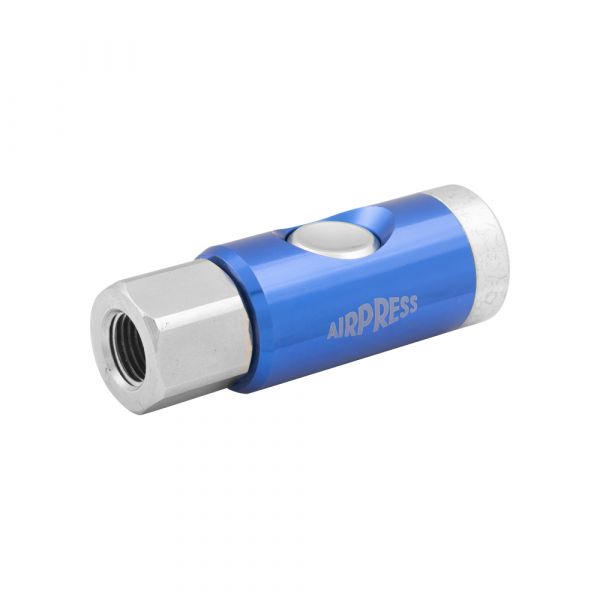 Hoogwaardige metalen veiligheidskoppelingen met geanodiseerde behuizing die van aluminiumlegering is. 2-drukmechanisme voor veilig ontluchten en ontkoppelen van de slang zonder dat de slang uit de koppeling schiet.