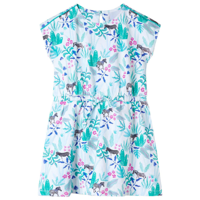 Dit kinderjurkje heeft een ronde halslijn, kapmouwen en een elastische tailleband met trekkoord en het sluit met een knoopje in de nek. Op deze kinderjurk zijn zebra's, bloemen en bladeren afgebeeld. Het korte kinderjurkje is gemaakt van zacht materiaal met 94% katoen en 6% elastaan voor comfort en beperkte kracht.