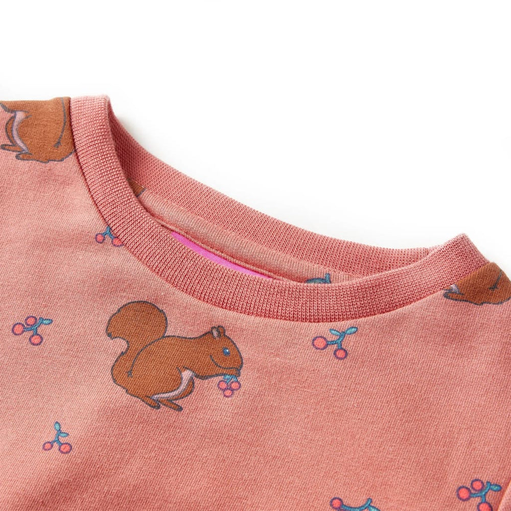 Deze kinderjurk heeft lange mouwen, een ronde halslijn en een trekkoord bij de taille. Op de meisjesjurk staan eekhoorns illustraties en hij heeft geribbelde randen bij de manchetten en halslijn. Het kinderjurkje is van zacht materiaal gemaakt met onder ander katoen en elastaan voor comfort en krachtig vermogen.