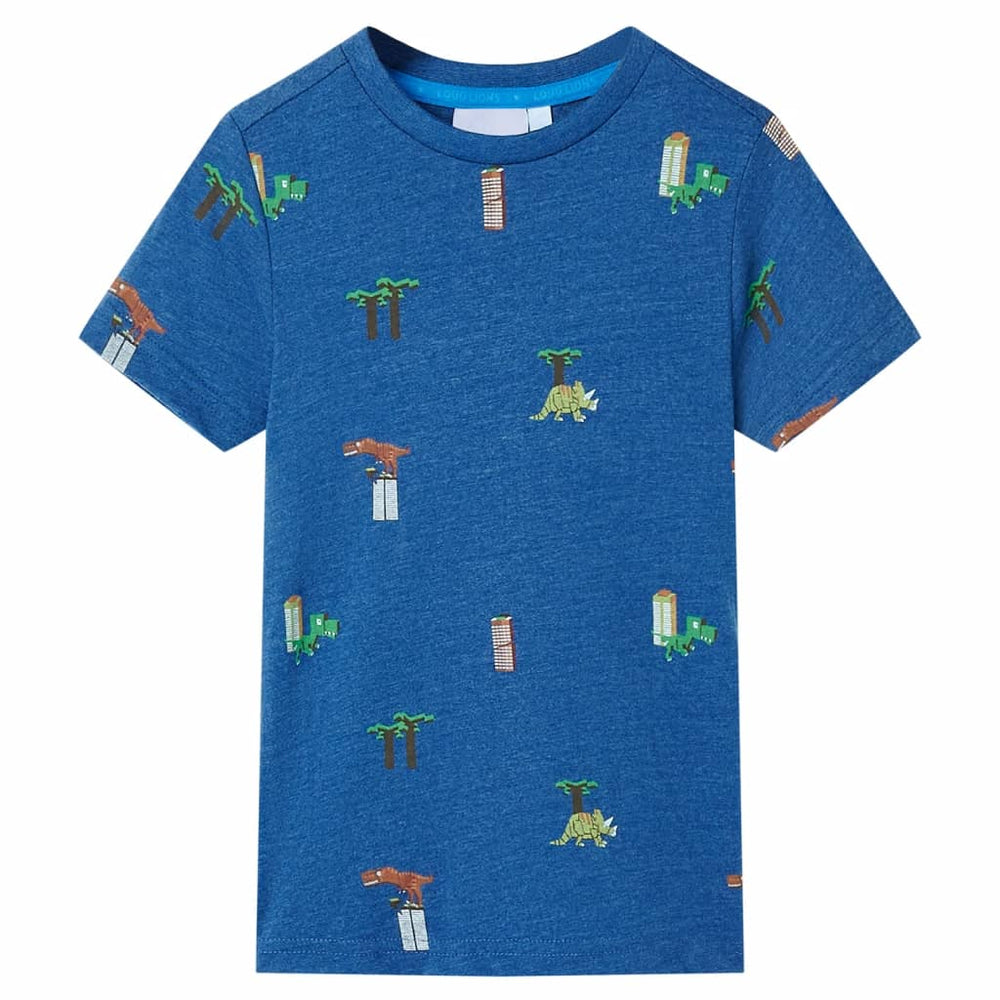 Dit kindershirt heeft korte mouwen, een ronde halslijn en een recht model. Dit T-shirt heeft een patroon van dinosaurussen, gebouwen en bomen. Het kindershirt met korte mouwen is gemaakt van 80% katoen en 20% polyester, waardoor hij zacht en comfortabel aanvoelt.